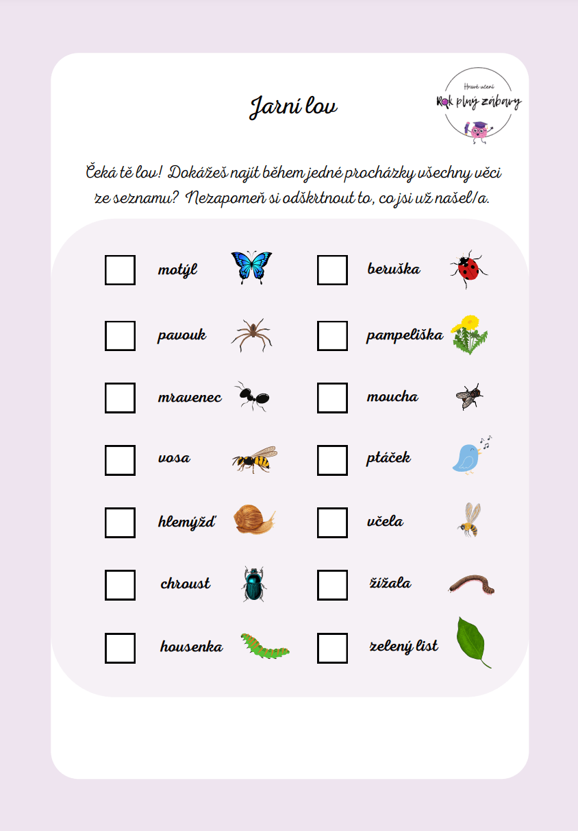 Jarní lov je hledací hra, kdy děti (i dospělí) dostanou seznam věcí, které mají najít v přírodě.
